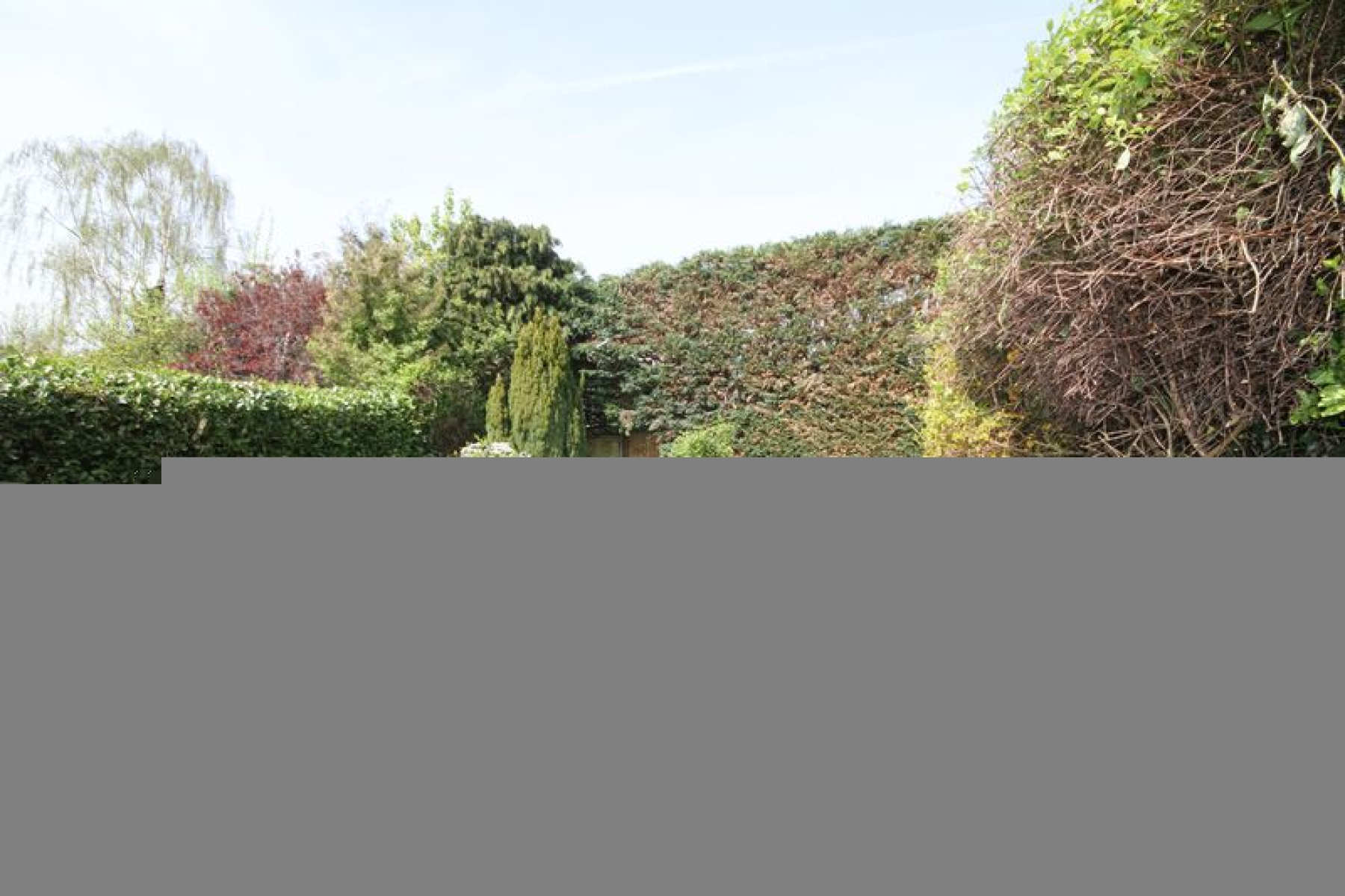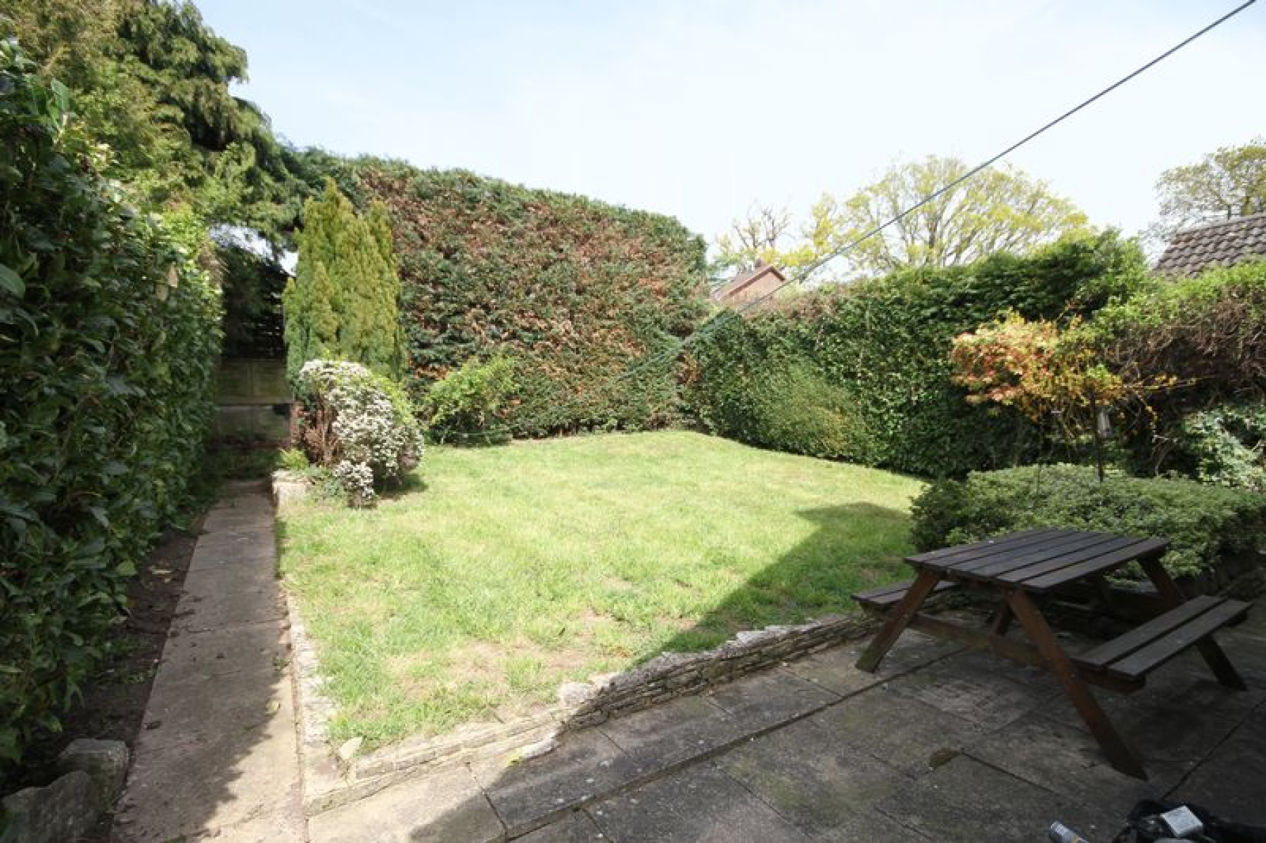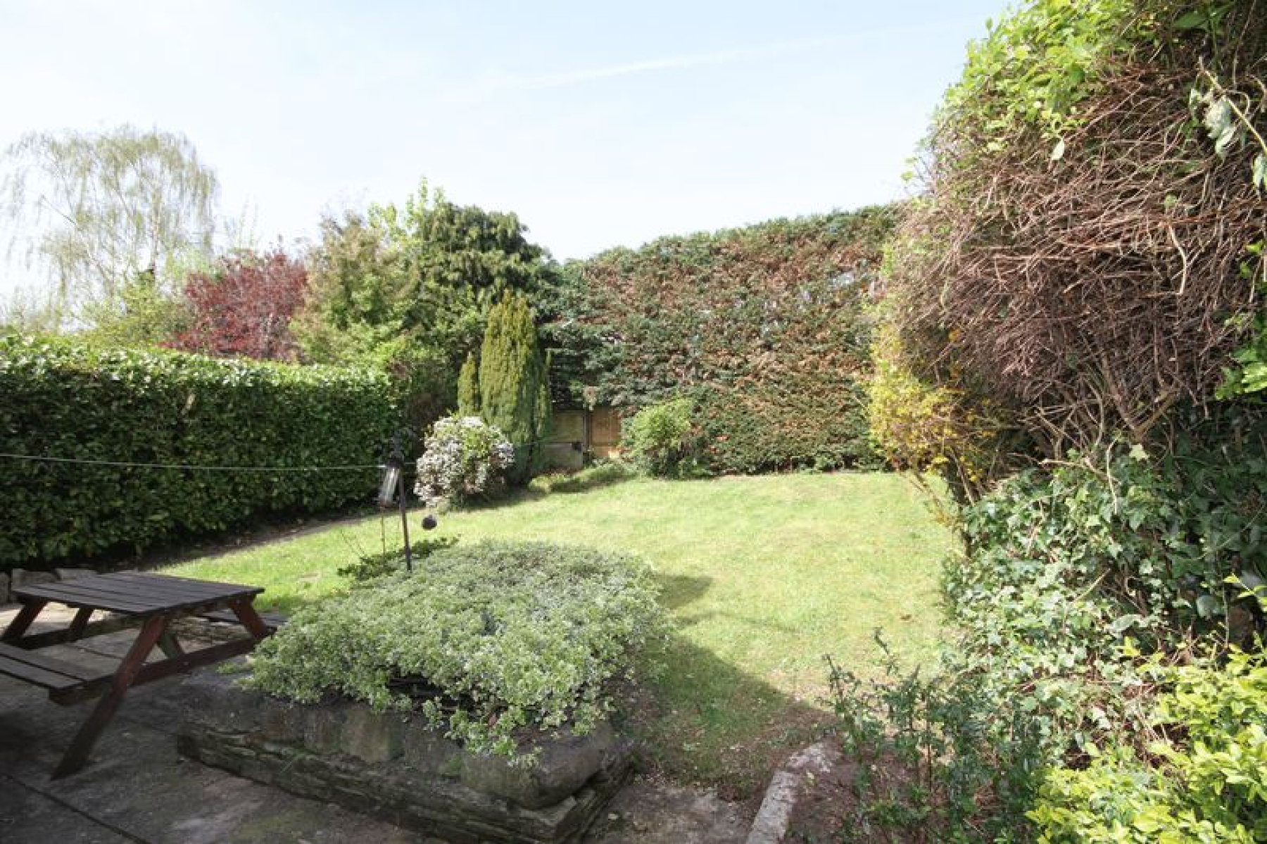 The sunny living room, with plenty of room for a dining area, leads onto a super patio area and secluded garden.