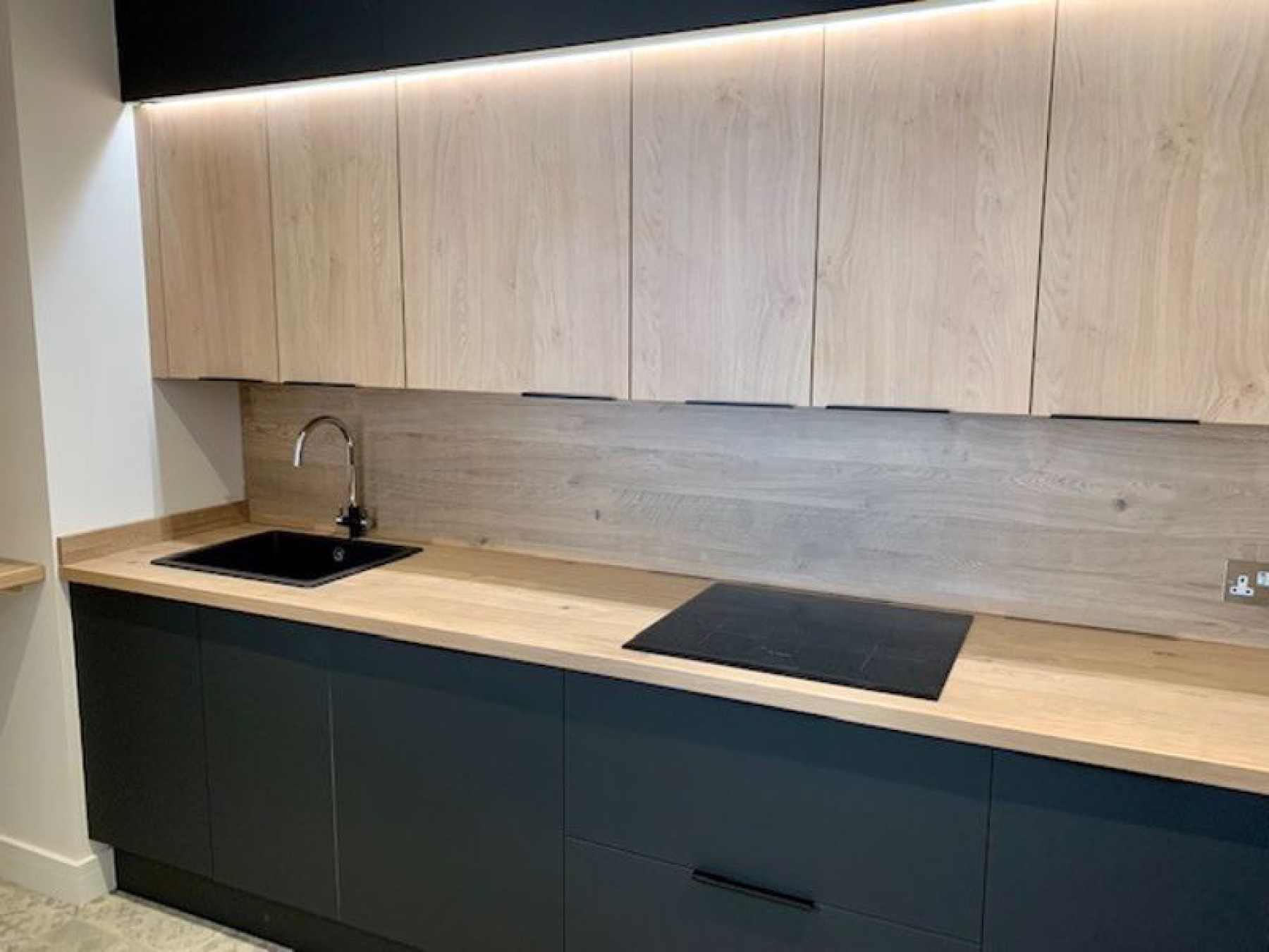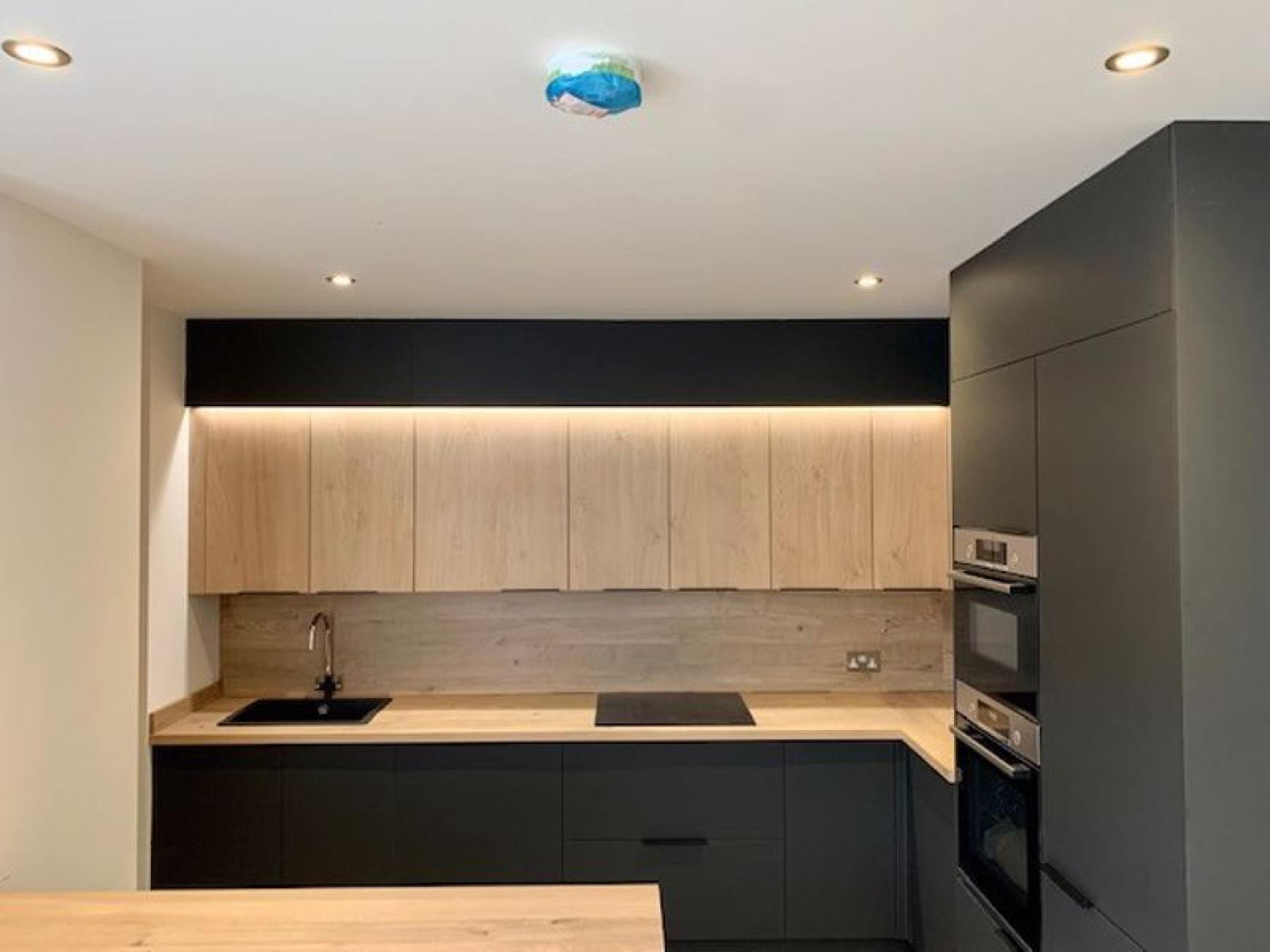 The modern fully fitted, dark and light kitchen with recessed spotlighting, fridge/freezer, washer/dryer and a large breakfast bar.